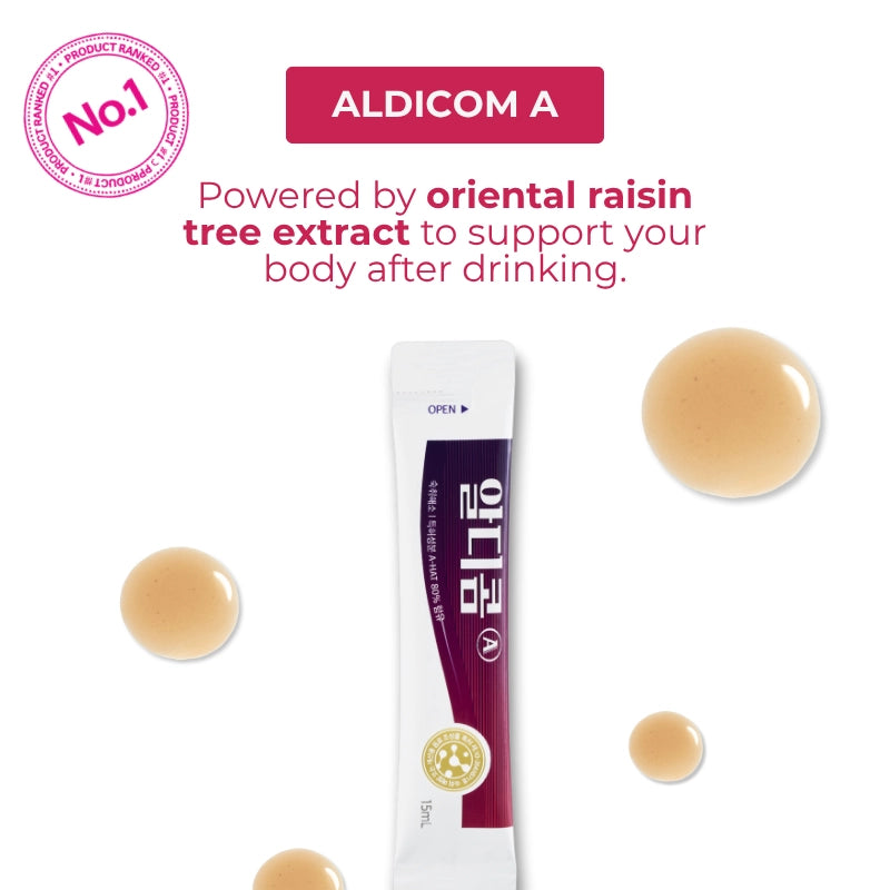 Aldicom is powered by a patented blend of 10 plant-based Korean ingredients, including Hovenia dulcis and peony root, known for their post-drinking benefits. Its signature A-HAT complex targets acetaldehyde, the toxic byproduct behind most hangover symptoms. In clinical studies, A-HAT helped lower blood acetaldehyde levels by 33.5% within 30 minutes, and alcohol levels within 0.5 to 2 hours. That means faster, measurable recovery — when your body needs it most.